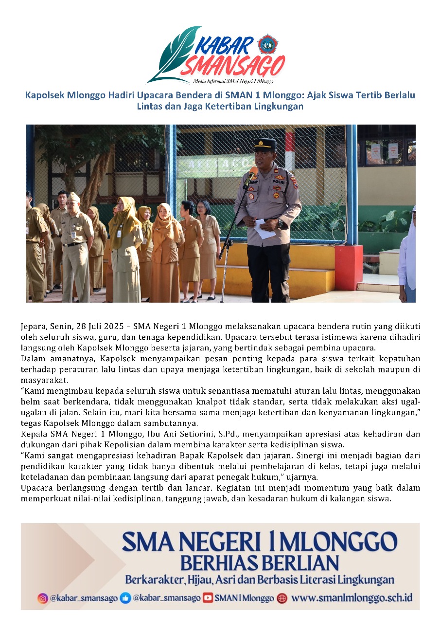 Kapolsek Mlonggo Hadiri Upacara Bendera di SMAN 1 Mlonggo: Ajak Siswa Tertib Berlalu Lintas dan Jaga Ketertiban Lingkungan