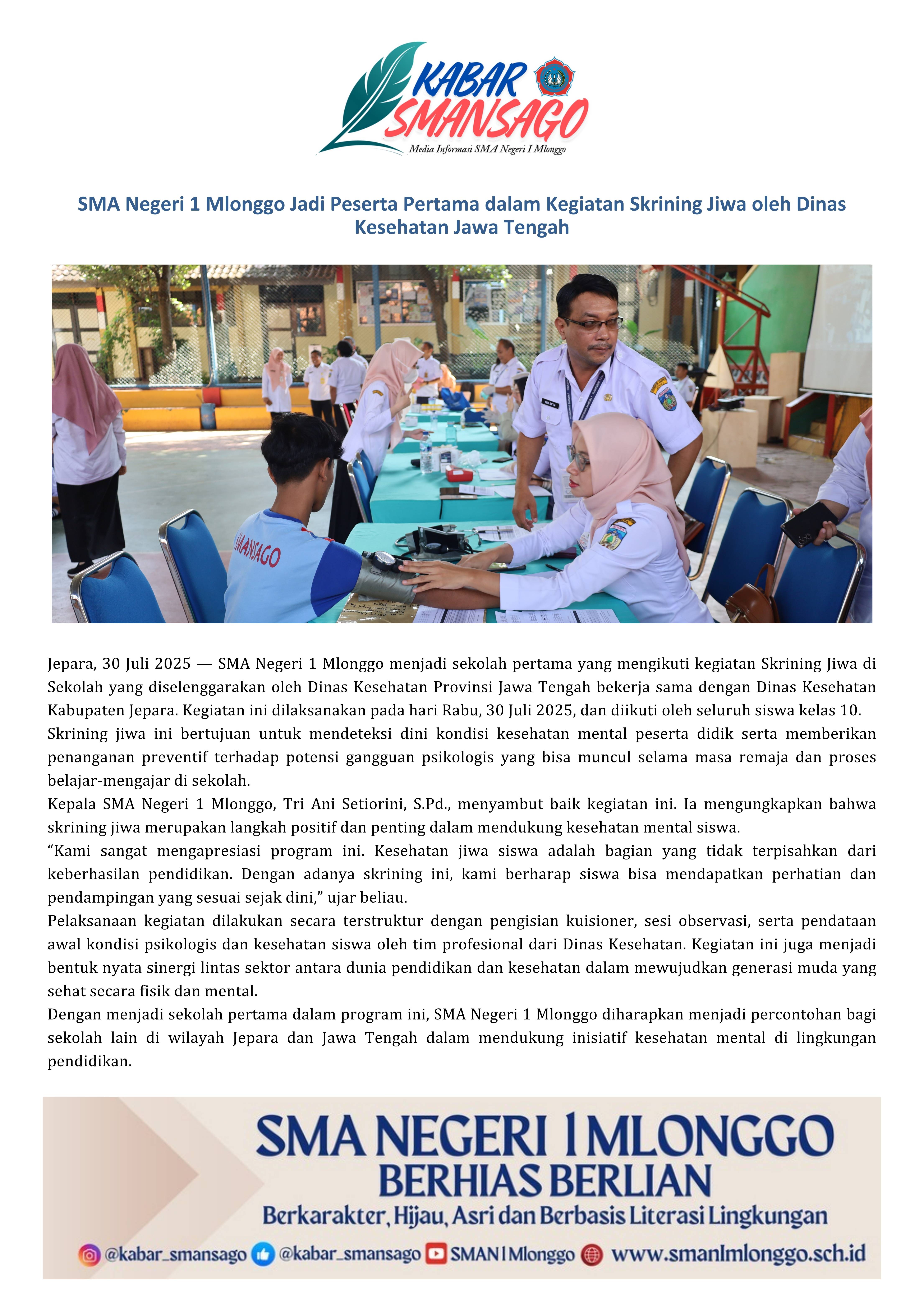 SMA Negeri 1 Mlonggo Jadi Peserta Pertama dalam Kegiatan Skrining Jiwa oleh Dinas Kesehatan Jawa Tengah